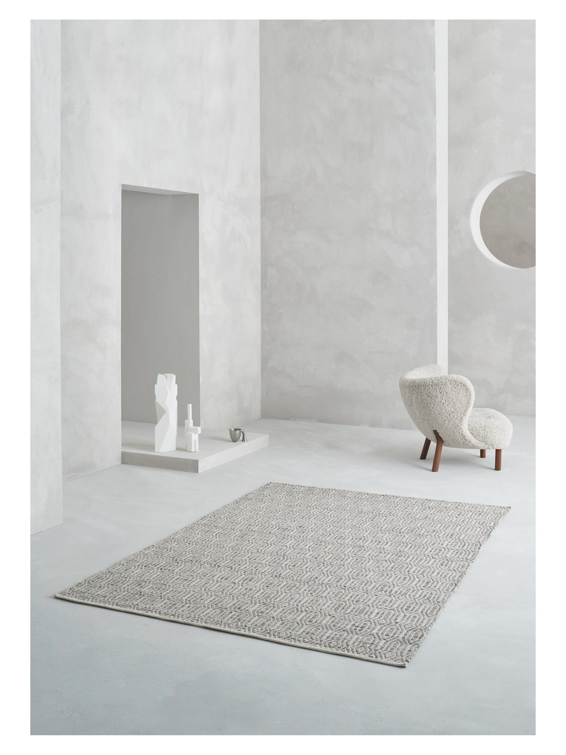 - Description : Justin uses light colours with an intricate structural pattern to create a masterpiece of understated elegance. Made from a wool-cotton melange that has natural nuances in the yarn, bringing a natural, one-of-a-kind quality to the rug's expression.