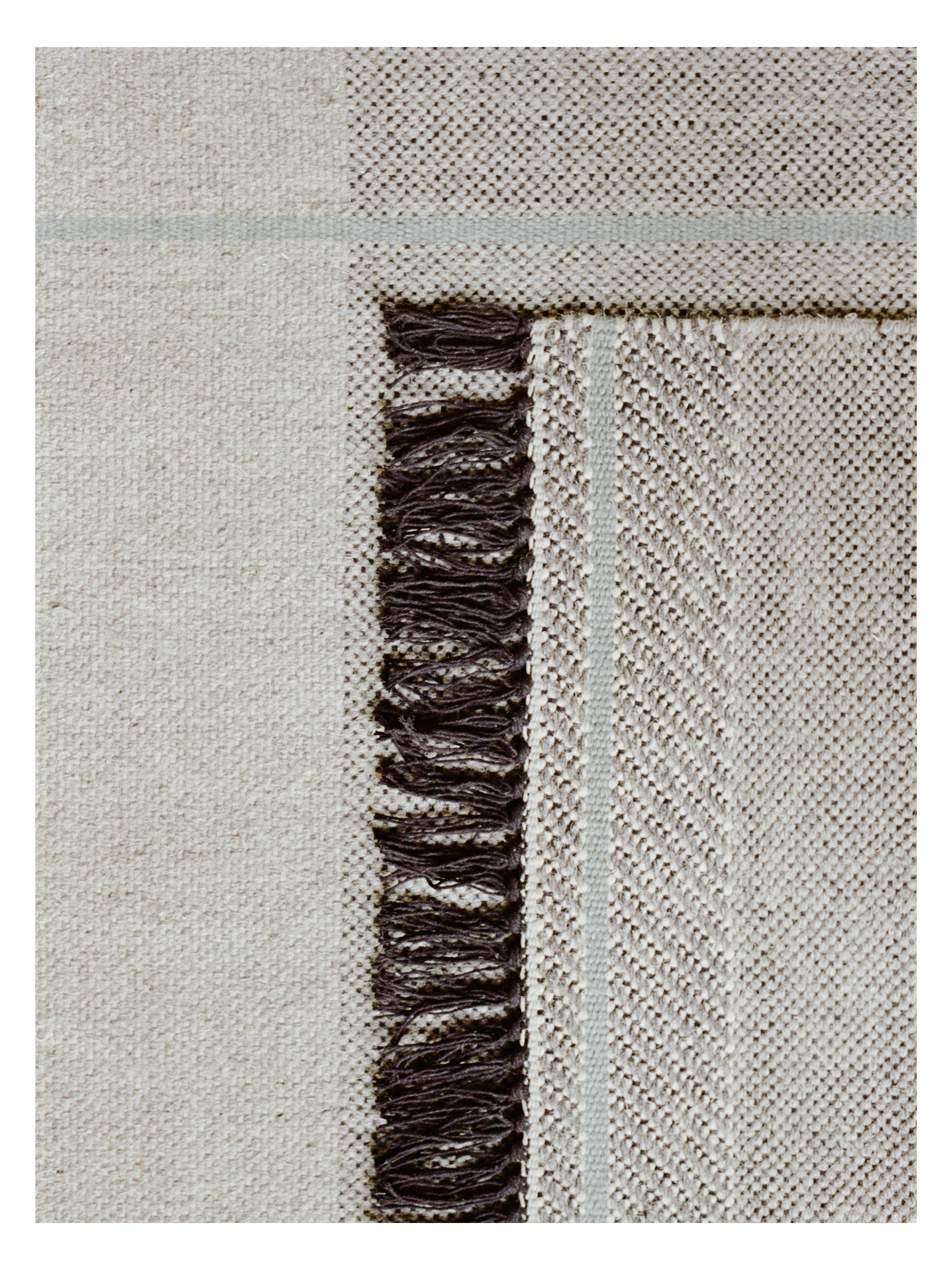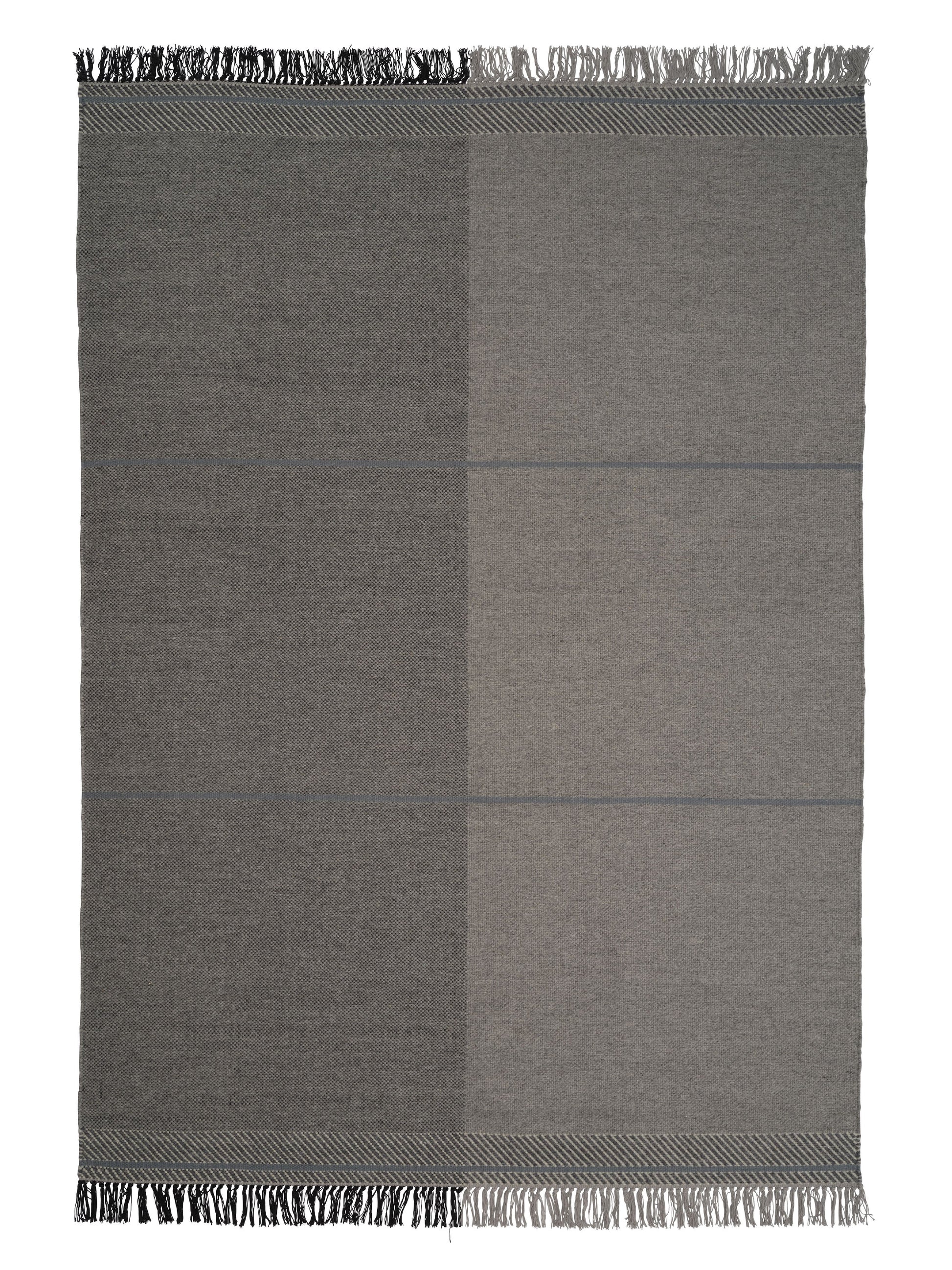 - Description : Mindful Soul combines undyed natural grey wool with contrasting monochrome colour to create a well-balanced aesthetic that both intrigues the eye and offers a sense of harmony. Crafted from soft and durable wool, with warp and fringing in organic cotton, the rug’s colour becomes more dominant on the other side, creating a subtle yet striking reversed effect.